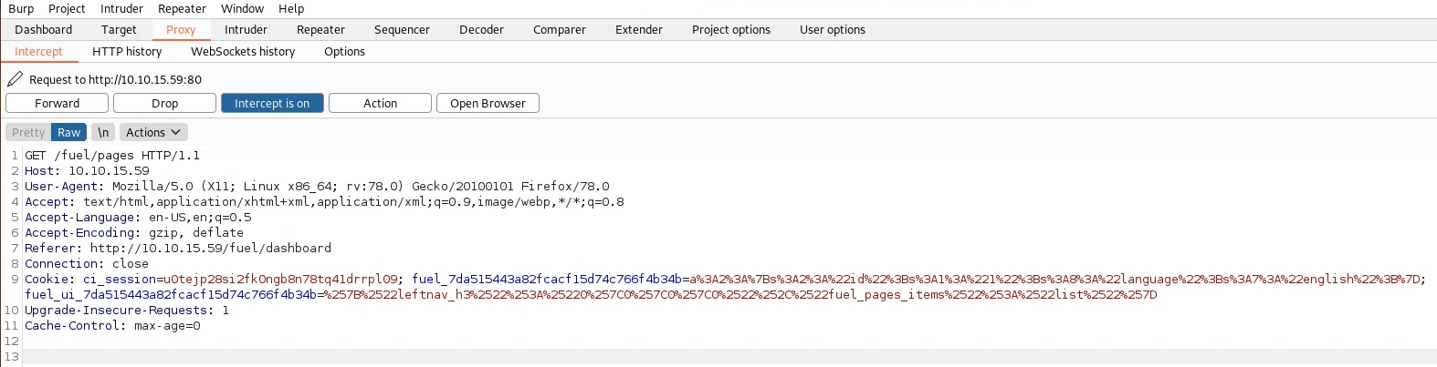 Lets navigate to the pages page on the left and start up BurpSuite. (If you don't know how to use Burp, I would highly recommend to checkout some tutorials online or if you're subscribed to THM check out this room).